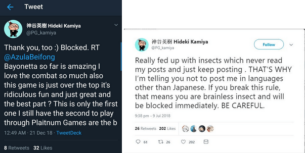 Hideki Kamiya, creator of Bayonetta, is also somewhat controversial. He often refers to westerners as “insects” on his Twitter (right). He has a habit of being excessively rude to fans online as well. He blocks any westerner who replies to him and makes a point of doing so as well (left).